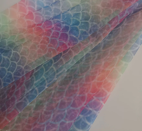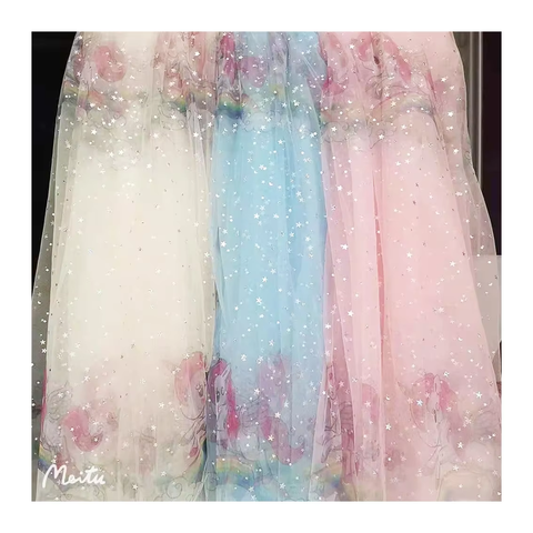 Phụ Nữ Của Bầu Trời Đầy Sao Cá Quy Mô Thiết Kế Dresses 100% Polyester In Cầu Vồng Gradient Vải Tuyn Warp Dệt Kim Lưới Vải Trọng Lượng Nhẹ